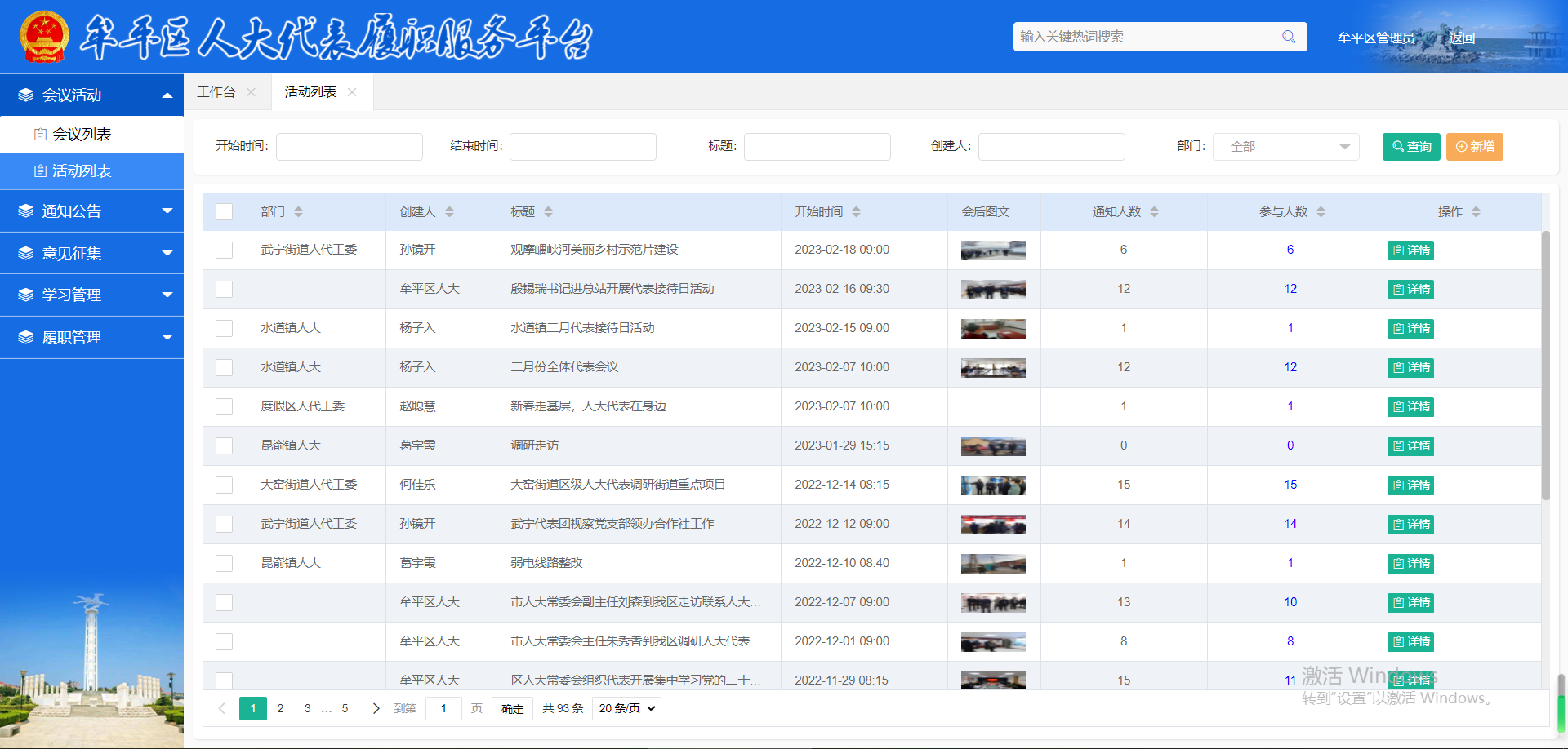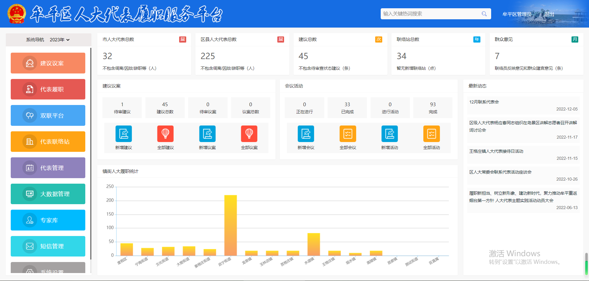 为推进“数字人大”建设,加大人大机关、代表、街道办、乡镇、承办单位全程数字化建设,牟平区人大于2022年下半年开始设计既方便区人大组织各项会议、代表活动,又方便代表、人大及区承办单位协同处理建议议案,同时有效辅助街道办、乡镇组织代表履职的智慧牟平人大代表履职服务平台。
