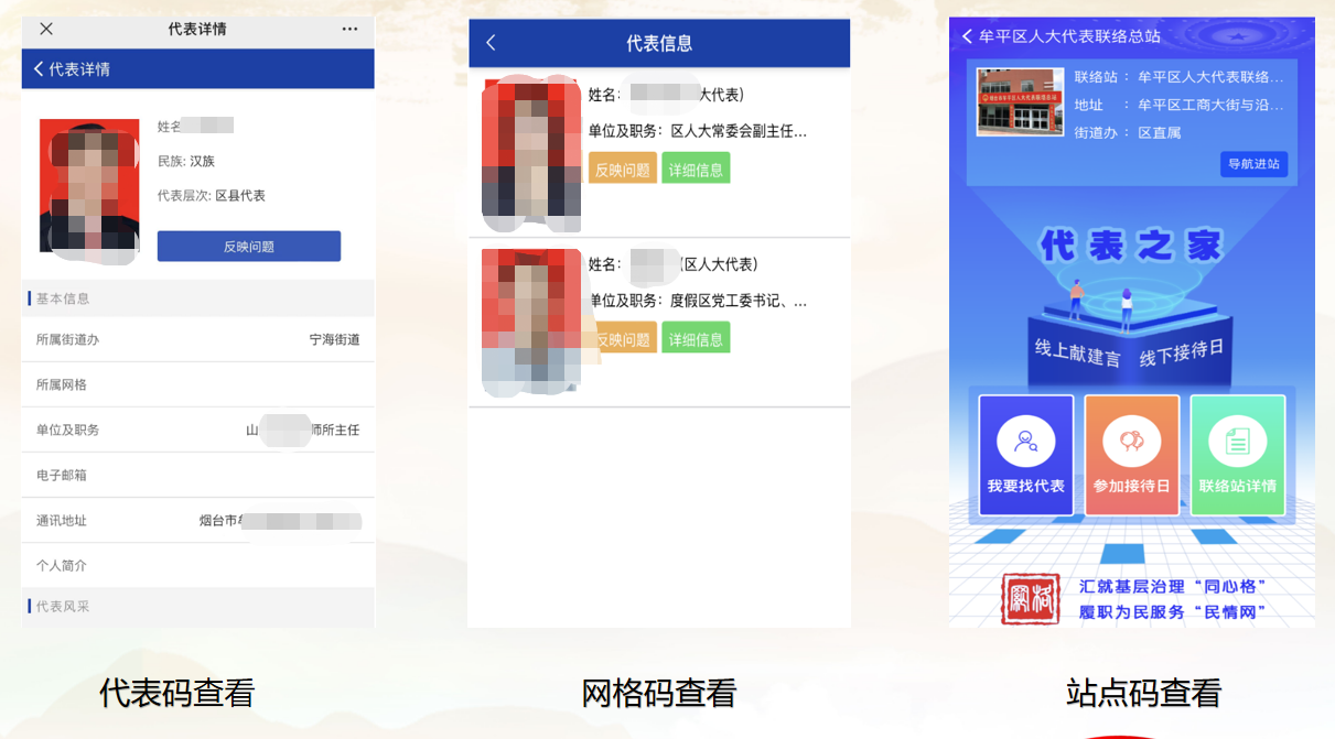 代表、联络站点、网格均配置各自专属二维码,群众扫码点对点反应民意给代表,代表将处理民生诉求分类反馈,重点事项直接转成建议的形式通过系统全线办理,建议办理完结后,代表再将办理动态和结果答复给群众。