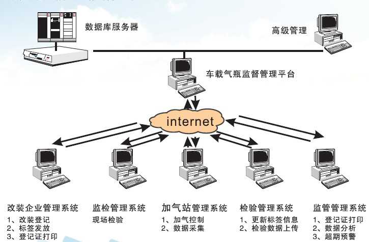 车载气瓶动态管理系统有改装企业管理系统、检验管理系统以及加气站管理系统等五个部分构成: